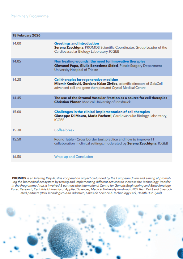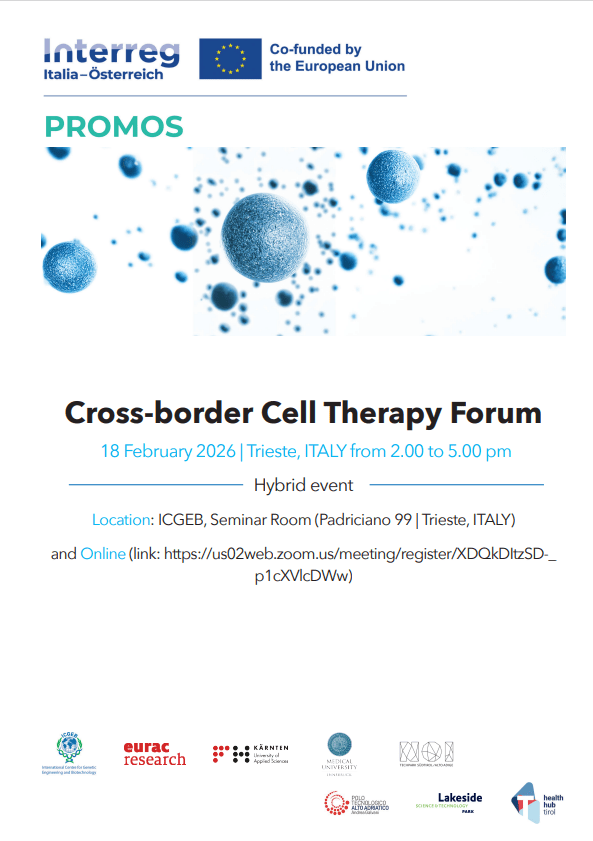 Il Cross-Border Cell Therapy Forum ha riunito clinici, ricercatori, esperti di trasferimento tecnologico e stakeholder del settore regolatorio provenienti da Italia, Austria e Slovenia per discutere lo stato attuale e le prospettive future delle terapie cellulari nella medicina rigenerativa. L’evento è stato organizzato nell’ambito del progetto Interreg Italia–Austria PROMOS, con l’obiettivo di rafforzare l’ecosistema biomedico e accelerare il trasferimento tecnologico nell’area del programma, con particolare attenzione al trasferimento di terapie cellulari innovative verso l’applicazione clinica nell’ambito del WP3.