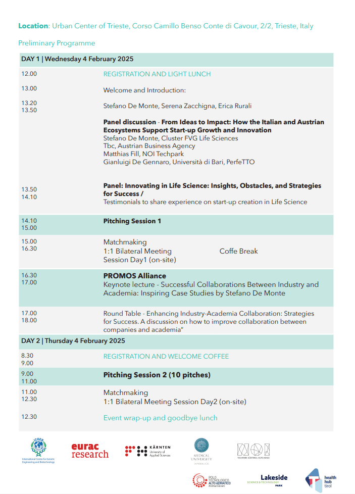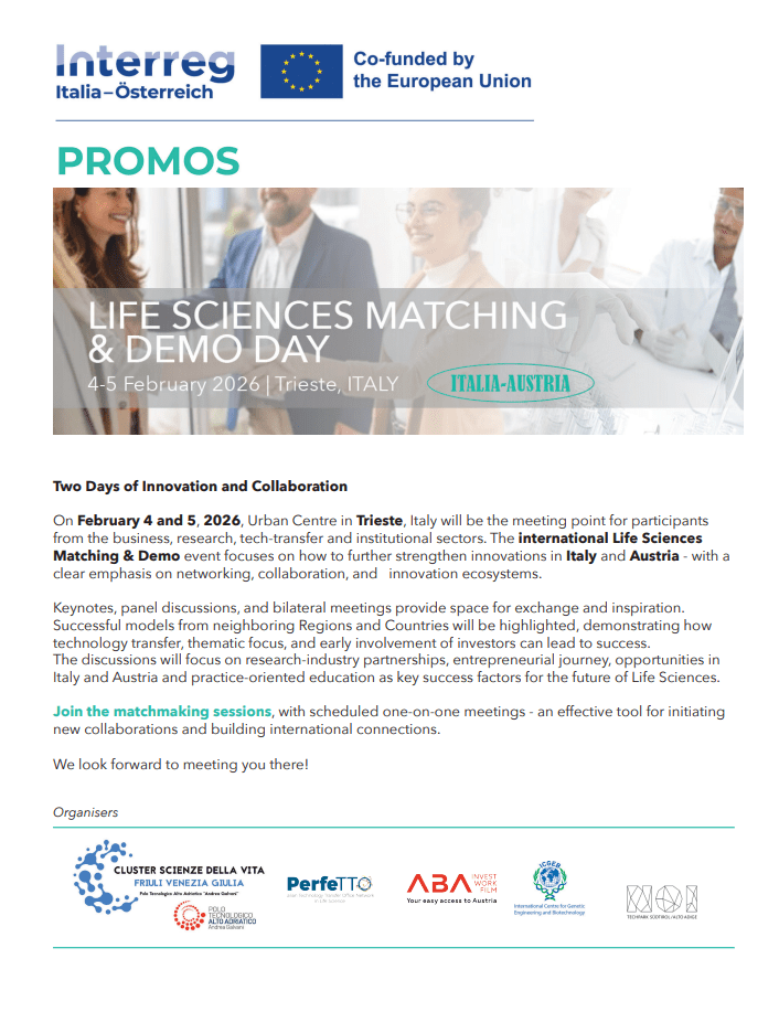 Die zweite Ausgabe des Innovation Meeting, das von den PROMOS-Partnern in Zusammenarbeit mit dem italienischen Netzwerk PerfeTTO und der Austria Business Agency organisiert wird, verspricht eine spannende internationale Veranstaltung für Innovatoren im Bereich Life Sciences in Triest.